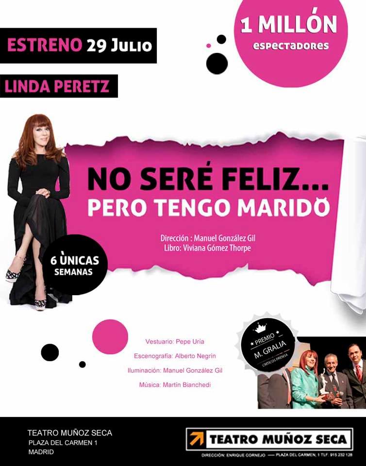 El señor Enrique Cornejo, empresario y propietario del teatro Muñoz Seca de Madrid ha extendido una invitación para el estreno de prensa de "No seré feliz pero tengo marido" el 2 de Agosto de 2016. Estreno general 29 de julio
